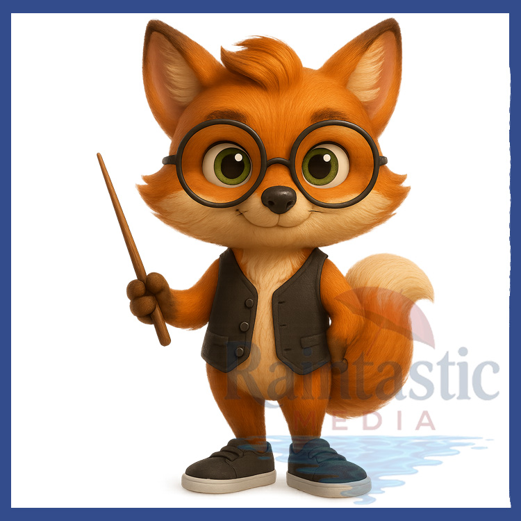 Professor Renard is Raintastic’s charismatic, hip science fox. With his sleek fur, sharp green eyes, and hair swept stylishly to the side, Renard commands attention without ever being boastful. He wears an open black vest with green buttons and classic sneakers. He believes that every kid can be a scientist, and that curiosity is the greatest teacher of all.